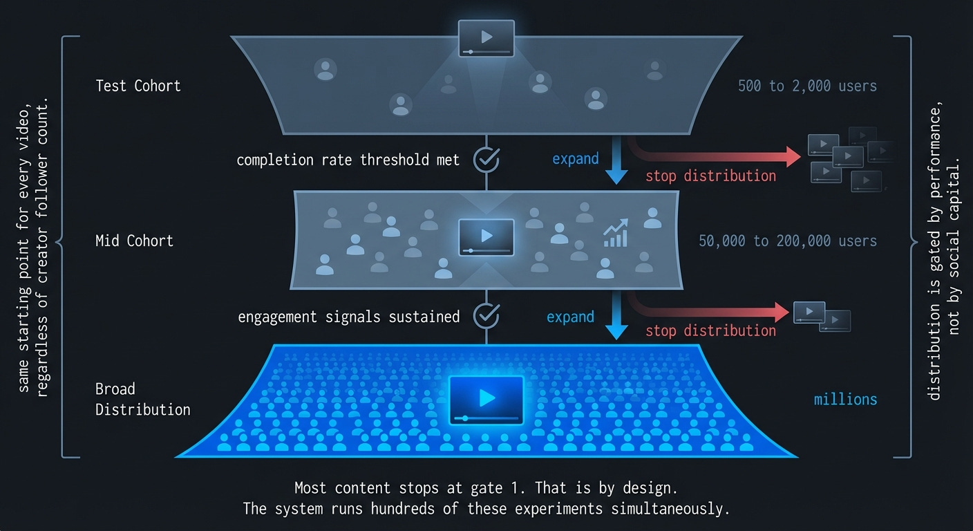 Every piece of content starts with a small test audience. If the engagement signals from that cohort cross a threshold, the system expands distribution to a larger group. Strong performance there triggers another expansion. Weak performance stops the cycle.