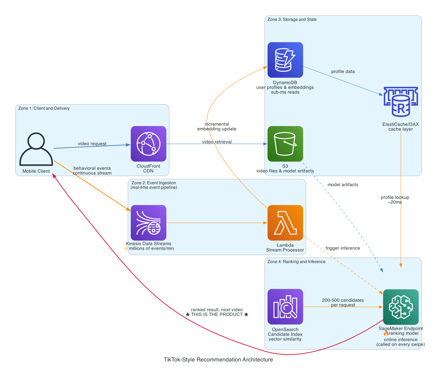 DynamoDB holds user state and profile vectors. The embedding lookup that happens before ranking needs to be fast, single-digit millisecond reads. DynamoDB with DAX for caching gets you there.