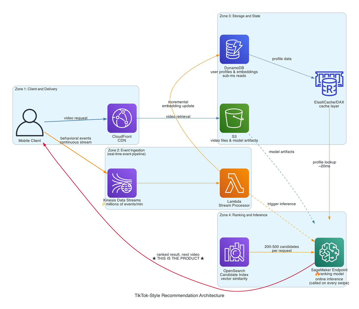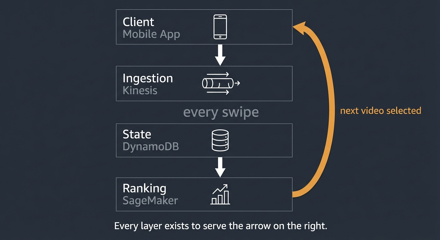 It won because the feedback loop is tighter and the latency budget is treated as a product requirement, not an infrastructure concern. The time from “user watched something” to “that information changes what they see next” is measured in milliseconds. The system learns within a session, not across sessions.
