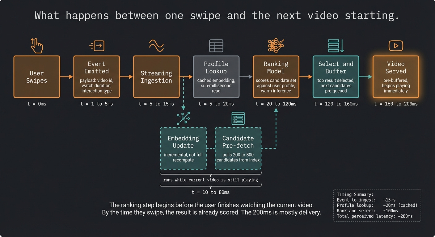 When you swipe to the next video, a chain of events fires. An event is emitted containing what you watched, for how long, and whether you interacted. That event hits a streaming ingestion layer. Downstream, multiple things happen in parallel: your user embedding gets updated incrementally, a candidate retrieval system pulls a few hundred potential videos that match your current profile, and a ranking model scores those candidates. The top result gets served while the next retrieval cycle is already running.