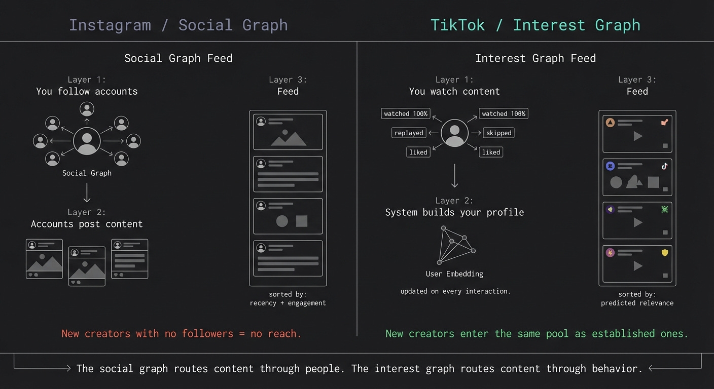 TikTok does not work that way. The social graph is almost irrelevant. You could open TikTok tomorrow having followed no one and get a feed that is more calibrated to you than your Instagram explore tab after three years of use.
