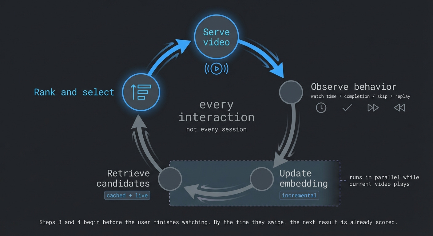 This doesn’t run once per day or once per session. It runs on every interaction. But it’s worth being precise about what “update” means here. The system isn’t recomputing everything from scratch on each swipe. It’s combining cached embeddings, precomputed candidate sets, and incremental updates to your profile. The loop is continuous, but the computation is layered and largely parallelized.
